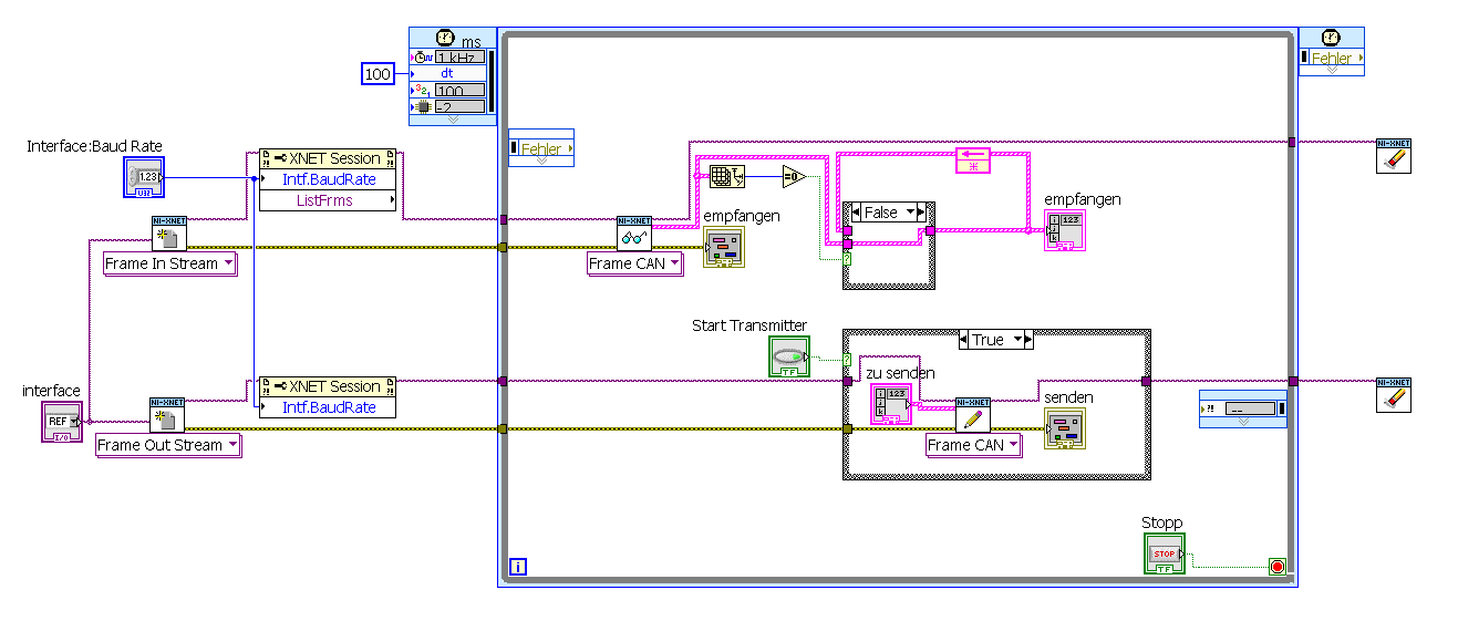 es wird (gemächlich) in einer Timed While Loop auf dem cRio RT ausgeführt . Wenn ich die Taste "Start Transciever" drücke wird eine Sequenz durchlaufen in der ich zuerst ein Frame auf den Bus schicke und anschließend ein Frame vom Bus lesen möchte. Das senden ist optional, d.h. es wird nur ein Frame gesendet wenn ich die Taste "auch senden" drücke. Das habe ich zum Beispiel benutzt um die Bootup Nachricht des Netzgeräts auszulesen.