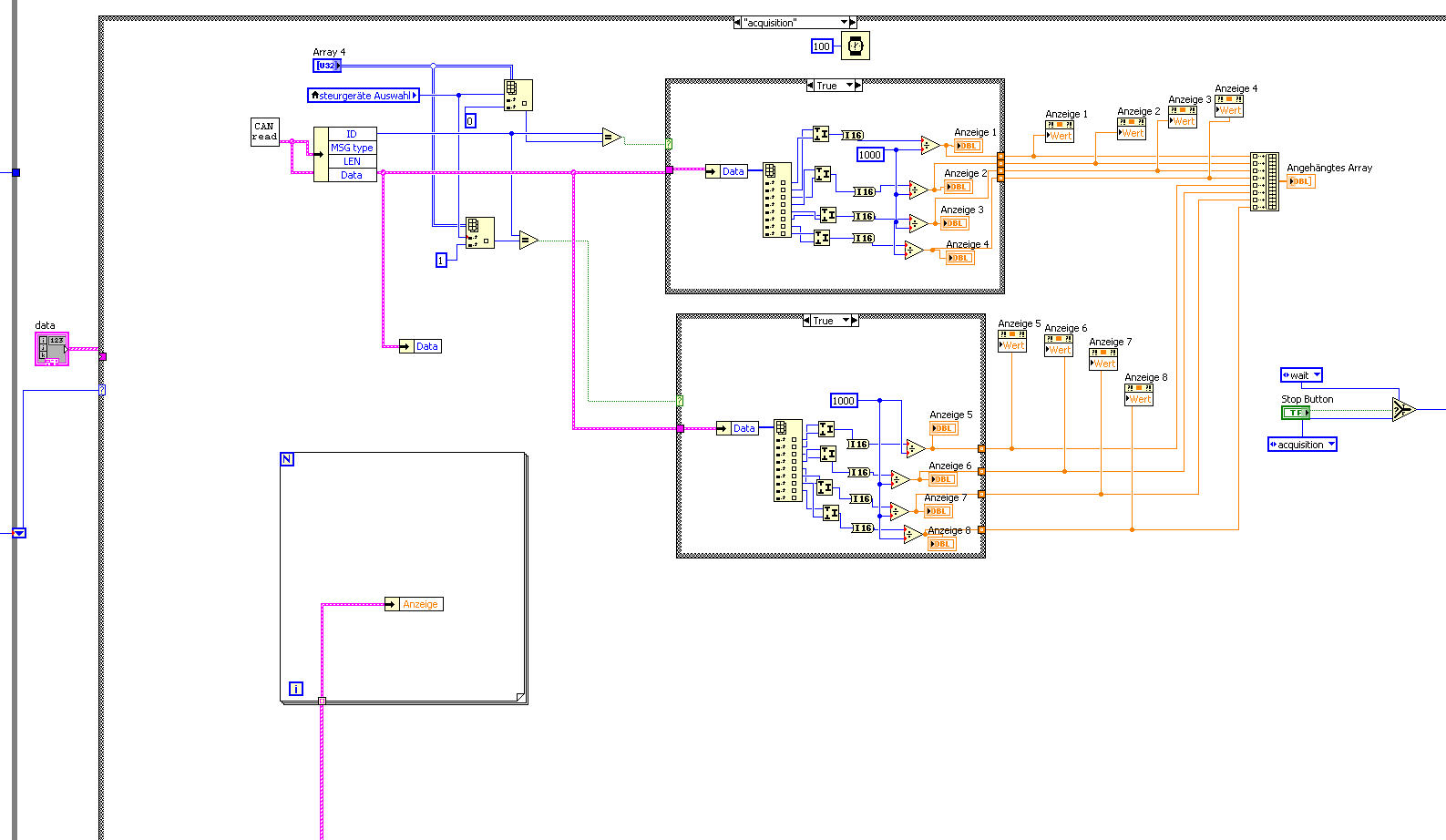 ich hätte eine Frage und zwar, Ich bin gerade ein Programm zu entwikeln um Daten von einem CAN Bus zu visualisieren. Alllerdings bin ich gegen ein problem konfrontiert: ich hab ein Array von Cluster mit 4 elemente und will im dritten element den wert von 'Anzeige' auf dem Blockdiagramm schreiben. so dass den Wert von Anzeige 1 auf dem Blockdiagramm dem wert von Anzeige(1,2,3...8) auf dem Frontpanel entspricht . Ist das überhaupt möglich? . Ich hab es mit Eigenschaftsknoten probiert aber dann sind alle element vom Array von Cluster auf dem Frontapanel mit der selben Werten gefüllt . Das will aber nicht ich will jedes element (ANZEIGE) mit dem entsprechenden wert aus dem Blockdiagramm ausfüllen.