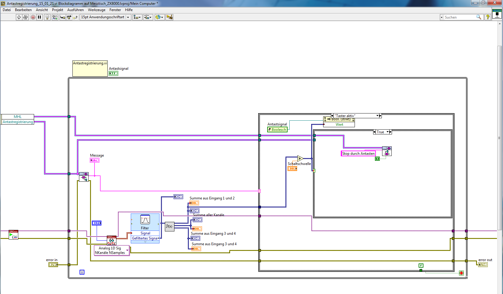 Bei dem Schema erkennt man, dass die Schleife im Antastregistrierungs.vi nur läuft, wenn ich „Taster aktiv“ oder „Taster inaktiv“ schicke. Somit werden auch nur die in dieser Zeit aufgenommenen Werte in den entsprechenden Graphen dargestellt.