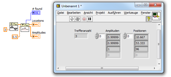 Bisher funktionierts so wie ich mir das vorgestellt habe. Die Positionen der Amplituden werden halt nicht als Ganzzahl angezeigt, sondern wie in der LabView-Hilfe angegeben als Teile von Indizes oder Amplituden, was die Lesbarkeit ein bisschen erschwert aber soweit passt alles.
