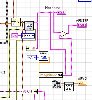 Wichtig war hier, aus dem AFilter Signal noch den RMS Wert zu ermitteln. Normal habe ich das mit den (im Bild) darunter abgebildeten "Mittelwert und RMS.vi" gemacht und es dann mit dem SubVI (danach) in dBV umgerechnet.