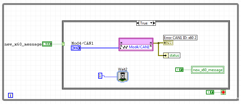 Zitat:Wenn ich in der Host-VI also alle 20ms eine Nachricht generiere und dem FPGA übergebe, dann versucht doch dieser in der Zwischenzeit die ganze Zeit die Message am Port rauszuschicken. Also angenommen ich würde den Schleifentimer im FPGA auf 1ms setzen, dann sollte die Nachricht jede Millisekunde auf dem CAN-Bus erscheinen.