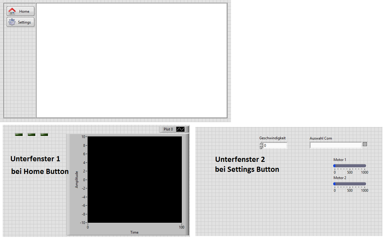 Oben links im Bild habe ich meine Hauptansicht. Links soll wie oben bereits erwähnt ein Menü mit Buttons erstellt werden. Mit dem Button "Home" möchte ich gerne das Unterfenster 1 laden und im weißen Bereich des Hauptfensters anzeigen lassen. Wenn ich anschließend auf den Button "Settings" klicke soll das Unterfenster 2 geladen werden.