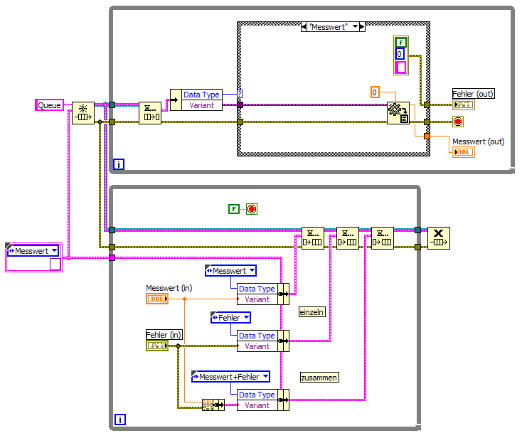 Ich habe es jetzt mal für meine Bedürfnisse etwas angepasst, aber ich bekomme dennoch nicht beide Datentypen (Messwer und Fehler) zusammen in die zweite Schleife und wenn ich es oben hin bekomme dann habe ich unten noch immer das Problem das wenn die Case Struktur umschaltet eines der Ergebnisse auf einen Wert gesetzt wird den ich angeben muss oder mit "Standard verwenden, wenn nicht verwendet" belegen muss.