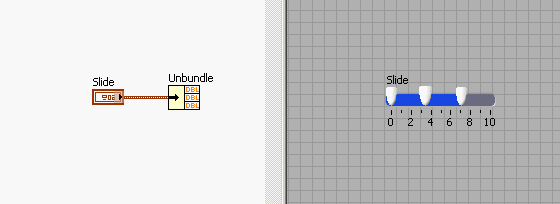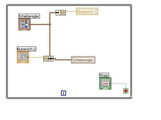 Also: Es geht nicht, weil die beiden Schieber im Blockschaltbild als Cluster dargestellt sind, und bei einem Cluster kann ich nicht ein Element als Eingang und ein Element als Ausgang konfigurieren.