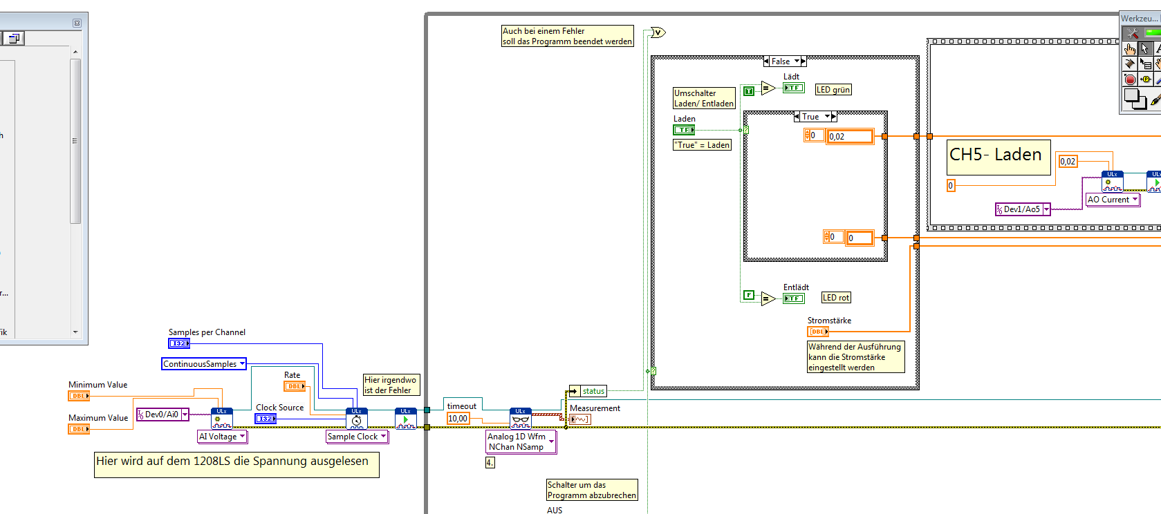 Wie schon die VIs für den Stromausgang an der 3106, benutze ich die von Meilhaus mitgelieferten Beispiel-VIs welche ich per copy&paste in mein Programm eingefügt habe. Den Strom erzeugen klappt wie bereits erwähnt einwandfrei, wenn ich jedoch das "Spannung-mess-und-Graph-erzeugen"VI in mein Programm einfüge passiert: nichts. und sobald ich das PRogramm via "Stop-Button" in der While-Schlife beende, kommt folgende Fehlermeldung: