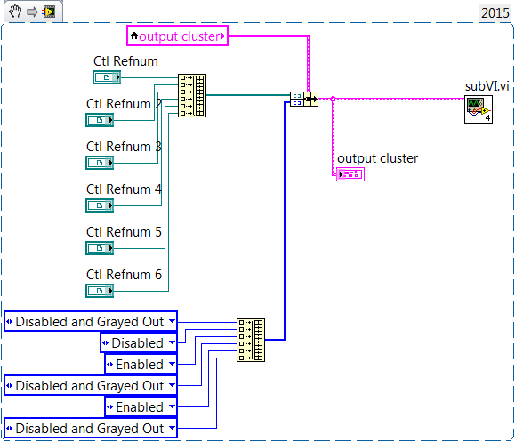 Besser wäre es aber, wenn du das subVI erweitern würdest: für deine Anwendung wäre es vielleicht sinnvoll, die Eingänge als Arrays auszuführen: ein subVI-Aufruf für mehrere Controls. Und die Referenzen nicht als strikt-typisiert, sondern als möglichst generisch vorsehen, damit du alle Control-Typen dis-/enablen kannst…