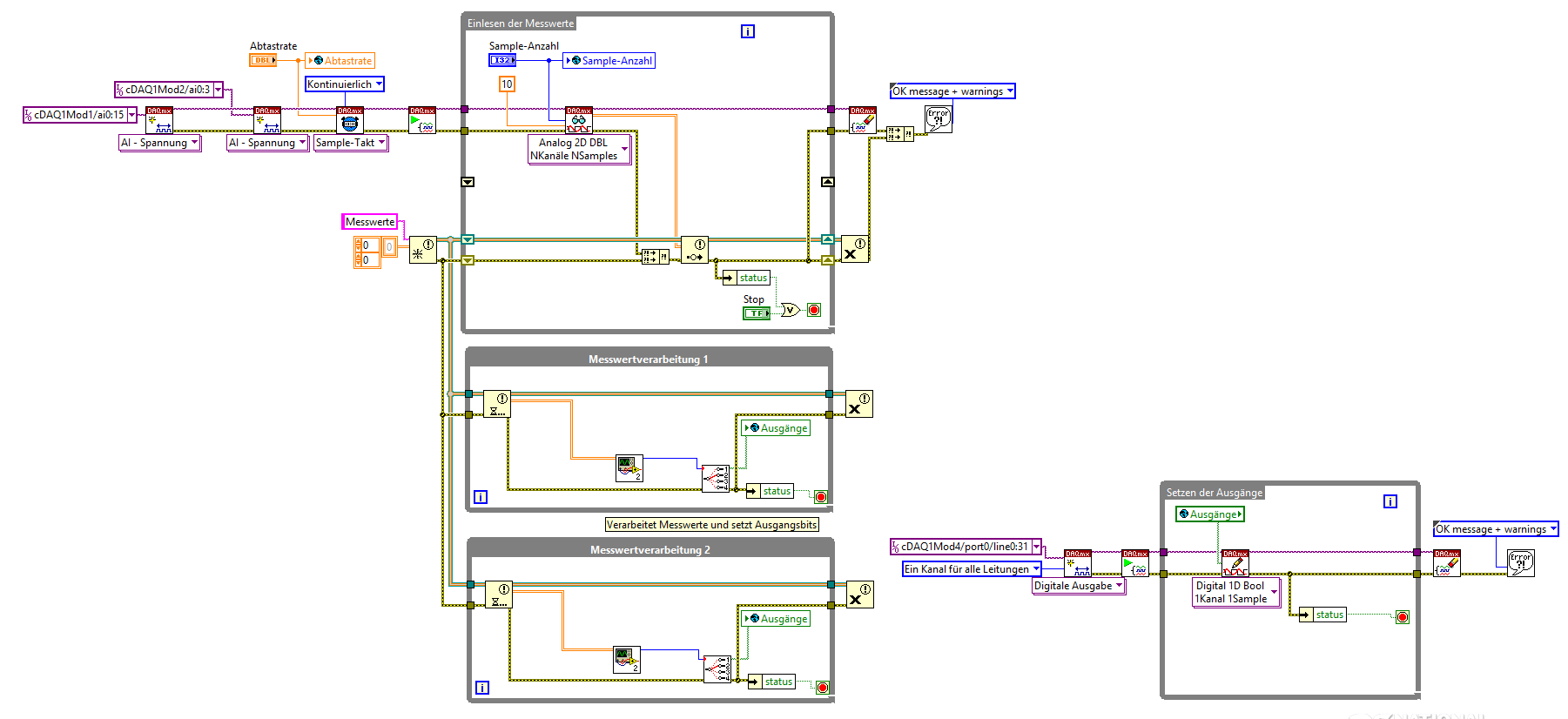 ich versuche mich erst seit kurzem an LabVIEW und möchte gerne ein VI zu programmieren, welches Messwerte über DAQ einlesen kann, Fehler erkennt und entsprechende Ausgangsbefehle an externe Schaltgeräte sendet.