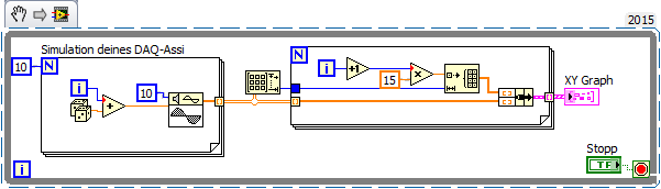 Danke für die Antwort. Punkt für dich mit dem Mittelwert, das hatte ich tatsächlich vor. Den Loop hab ich nur erstellt, weil ich ein Tutorial gesehen hatte, wo ein Graph auf diese Weise erstellt wurde. Eigentlich dachte ich, dass ich den Loop nicht brauche, eine endliche Erfassung würde reichen. Seh ich richtig, dass es hier mehrere Wege zum Ziel gibt und dein Vorschlag einer davon ist? Ich hab den xy-Graphen jetzt durch einen Waveform Graphen ersetzt und das From DDT eingefügt. Die Verbindung klappt jetzt schonmal Smile