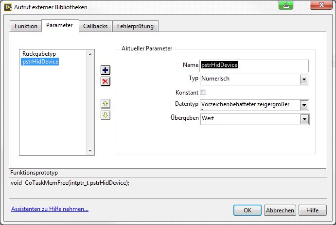 2) CoTaskMemFree() funktioniert so wie Du es im Moment anlegst zwar für 32 Bit LabVIEW vielleicht, ist aber eigentlich auch falsch. Hier solltest Du den Paremeter ebenfalls als Pointersized Integer, als Wert übergeben konfigurieren, genauso wie den Rückgabewert der vorigen Funktion.