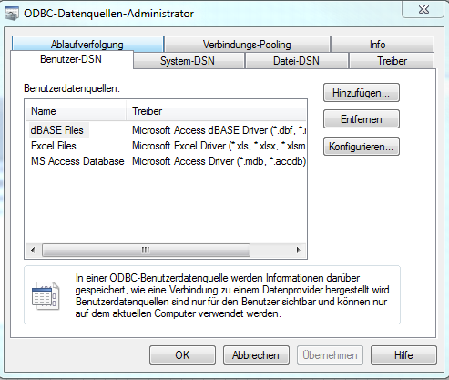 Hab dann auch nochmal das gleiche mit der Benutzer DSN Konfiguration versucht.