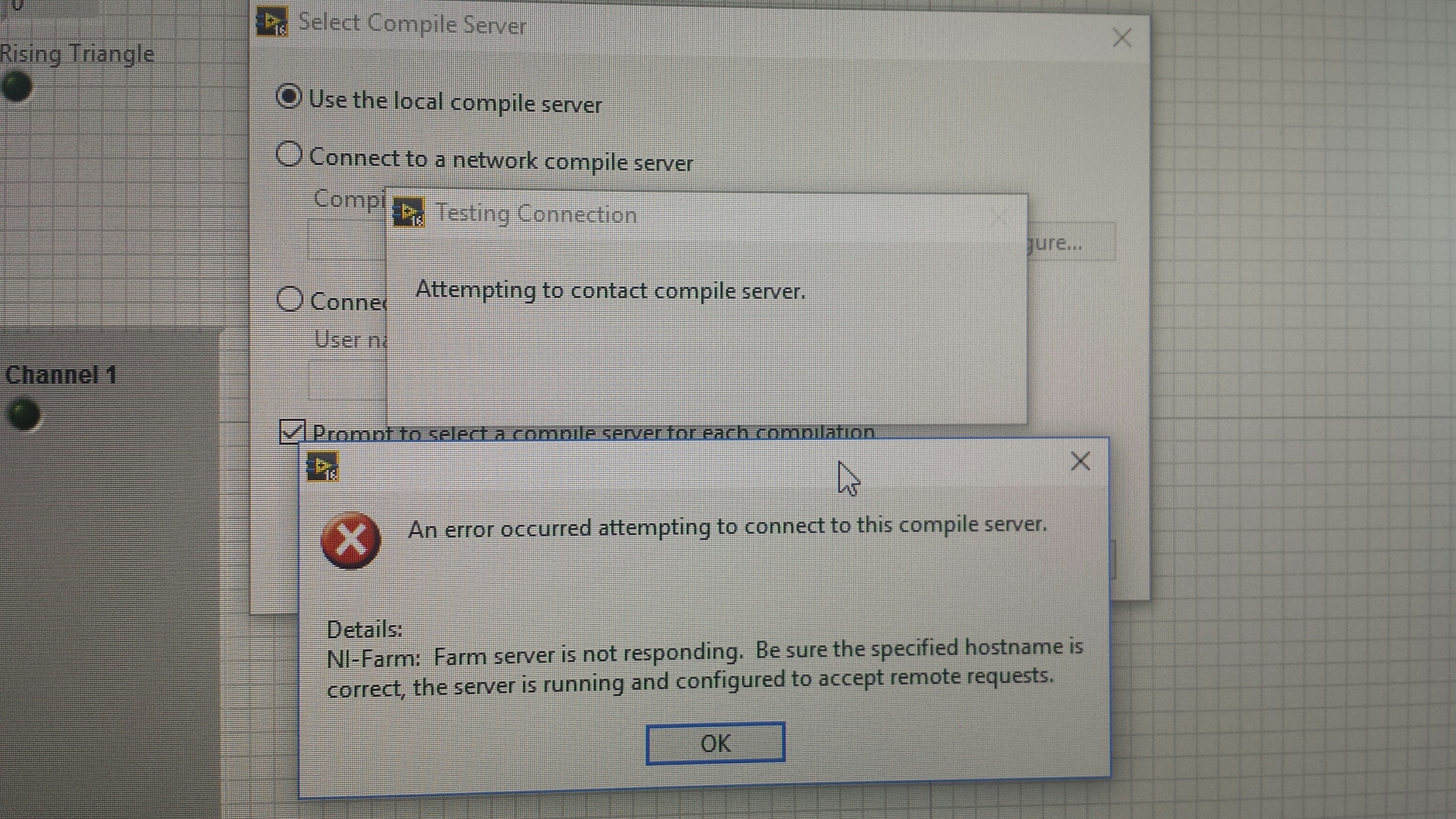 Ich habe "Use the locale Compile Server" angewählt. Daraufhin kam die Fehlermeldung (siehe Anhang). Als Software habe ich LabVIEW 2016, LabVIEW Realtime und LabVIEW FPGA installiert. Auch den Xilinx Compiler hatte ich mir (nachträglich) installiert. Ich bekomme trotzdem diese Fehlermeldung ausgespuckt.