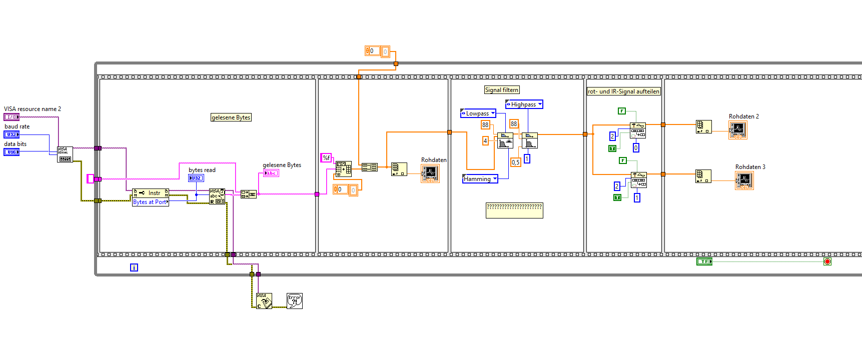 4. Dann nutzt du die Funktion "Dezimieren kontinuierlich" zweimal - warum nicht einfach einmal DecimateArray? (Natürlich nur, wenn man vorher die Messdaten auch korrekt vom Arduino liest!)