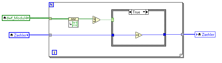 Und zwar wandle ich die Waveform zuerst in ein Boolean Array um, anschließend folgt ein OrArrayElements VI um dann die Flanken zählen zu können.