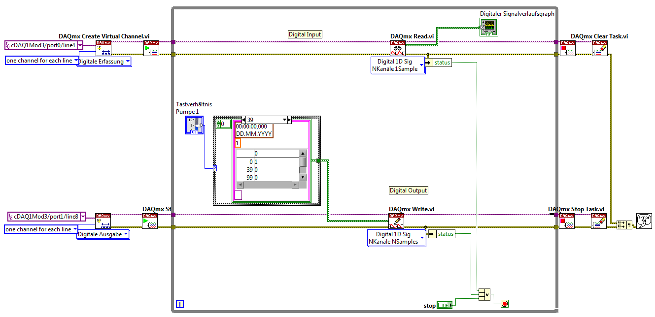 Ein DAQ-Assistent alleine bietet mir leider nicht die Möglichkeit die DIs und DOs vom NI 9375 zeitgleich kontinuierlich zu verwenden. Zwei DAQ-Assistenten erzeugen zwei Tasks welche miteinander konkurrieren (wenn ich das richtig verstanden habe, werden zwei Tasks von Modulen der C-Serie nicht unterstützt). Wenn ich im DAQ-Assistenten "Endliche Anzahl" statt "Kontinuierlich" wähle und die Asisstenten miteinander verschalte, kann ich Signale ausgeben und einlesen, erhalte damit aber nicht das gewünschte PWM Bild.