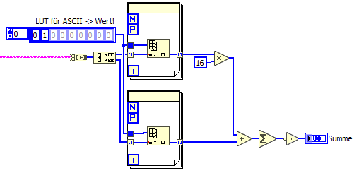 also, mal zur Ansicht (siehe Anhang), die Schleifenlösung ist schon was langsames, mein "Nichtschleifenansatz" ist zwei- bis dreimal schneller. Parallelisierung ist natürlich ein Ansatz, da ich aber nicht genau weiß wie viele S-Records es sind muss man sicher einigen Gehirnschmalz in die "Verteilung" stecken. Ich hatte gehofft durch eine geschickte Transformation des Strings ein Array aus zwei-Zeichen-Strings zu erzeugen, welches ich dann auf die Funktion Hex-String-nach-Zahl gebe und dieses wiederum auf Array addieren usw. Da ist man ja mit der Funktion Tabellen-String nach Array auch nah dran, nur leider gibts im S-Record kein Trennzeichen. Kann ich nicht irgenwie eine Formatierung vorgeben die LV dazu veranlasst immer zwei Zeichen in ein Array-Element zu packen ?