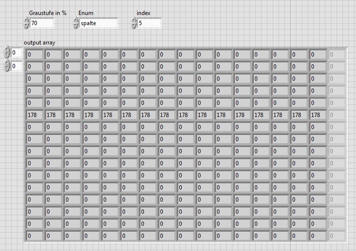 Ich habe ein Problem beim Array in Labview zu befüllen, also es geht darum, dass ich ein Bild in Labview erzeugen muss,wird wieder einer Pixelmatrix bzw. Ansteuermatrix 3 Dimensional nehmen in dem das Array von 16*16 Pixel erzeugt werden und dazwischen muss schwarz sein wie in Bild "ff" zusehen, jede Pixel von diese 16 besteht auch aus 6*6 Pixel und wird in Graustufe befüllt das heißt von schwarz bis weiß oder von 0 bis 255 für jede Zahl gibt ein Graustufe. das alles habe ich bis jetzt geschafft