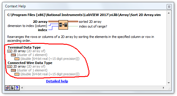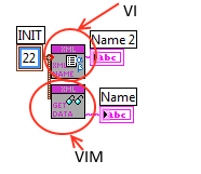 Ich erstelle ein Cluster welches die Bezeichnung INIT hat. Mit der oberen VI kann ich diese Bezeichnung auslesen. Sie wird korrekt in "Name 2" angezeigt. In dem VIM wird dasselbe VI ausgeführt und es wird der Name des VIM Eingangs angezeigt.