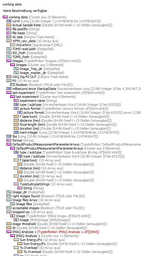 Jetzt habe ich ein Problem (na gut kein dramatisches) wenn ich in den typdef'd Cluster "working data.ctl" den ebenfalls typdef'd Cluster "IMAQ Analysis 1.ctl" einfüge ist der nicht typdef'd... keine Ahnung wieso.
