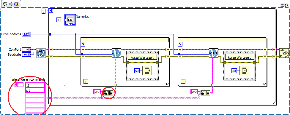 Zitat:Wenn ich eine längere Schleife erstelle(in meinen Fall ist "for-Schleife") werden nicht alle eingegebene Befehle ausgeführt. Aber wenn ich in den Blockdiagramm auf das Symbol mit der gelbe Lampe drücke dann und starte dann funktioniert alles tip top. Also muss ich hier iwie die ComPort Einstellungen verfeinern?