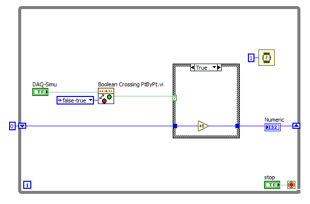 Nur leider weiß bzw. bekomme ich es einfach nicht hin, statt dem Schalter den DAQ-Assistenten zu nehmen. Wenn ich das versuche funktioniert nichts mehr bzw. wird der Status am DAQ-Assistenten nur aktualisiert wenn ich das Programm stoppe und wieder starte. Es sollte aber bei jedem Signalwechsel (ich habe bei meiner Anwendung unterschiedliche Zeiten zwischen ein/aus) der Status den der DAQ-Assistent ausgibt aktualisiert werden. Zusätzlich soll auch der Status (ein/aus bzw. 1/0) in einem Anzeigeelement angezeigt werden.