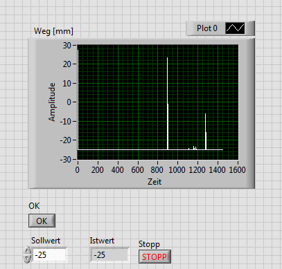 Also wenn ich das Linearpoti auf physikalisch 0mm setze und dann bspw. an dieser Stelle -25mm angezeigt haben möchte, soll der OK-Button gedrückt werden und damit der gemessene Wert (MEAN) die -25mm annehmen. Dennoch soll das ganze dann weiterhin gemessen werden können. Sprich, wenn ich physikalisch 50mm einstelle sollte mir nun automatisch +25mm angezeigt werden und natürlich auch alle Werte während des verstellen des Wegaufnehmers. Deshalb auch das untere Schieberegister, damit die Werte im Graphen immer aneinandergereiht werden.