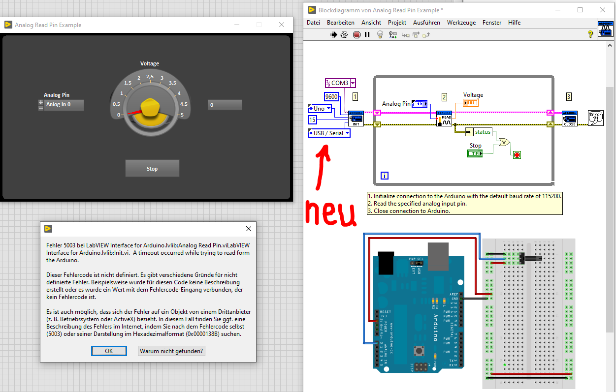 In LabView öffne ich nun das Arduino Beispiel "Analog Pin Read Example". Der Uno und das Poti sind genau so verdrahtet, wie auf der Grafik im Blockdiagramm dargestellt. Beim Drücken des Ausführen-Knopfes beginnt am Arduino die RX Led zu blinken, jedoch nicht die TX-Led. Nach ca. 30 Sekunden erhalte ich den Fehler 5002, es konnte also keine Verbindung hergestellt werden (Screenshot 1).