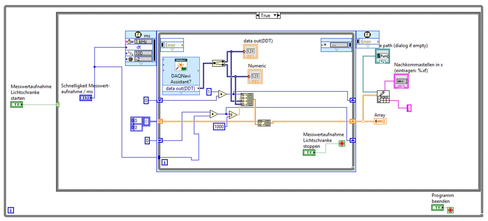 Wie kann ich denn passende Blöcke an Messdaten abfragen? Ich dachte, das hätte ich schon dadurch gelöst, dass ich in meinem VI in ein Array reinschreibe und das dann nur nach Beenden der While-Loop abgespeichert wird. Also ich verstehe hier einfach den Zusammenhang leider nicht, was genau du damit meinst, dass ich Blöcke an Messdaten abfragen soll und nicht immer nur einen Einzelwert. Verstehe ich das richtig, dass ich in diesem Fall über Labview nicht wirklich etwas machen kann, sondern an meiner Hardware (ich vermute mal, die Lichtschranke oder dem USB-Modul?) rumhantieren müsste? Sorry, wenn ich mich da etwas dumm anstelle, aber das ist wie gesagt leider nicht mein Gebiet und das hält mich nun schon länger auf, als ich vorerst dachte...