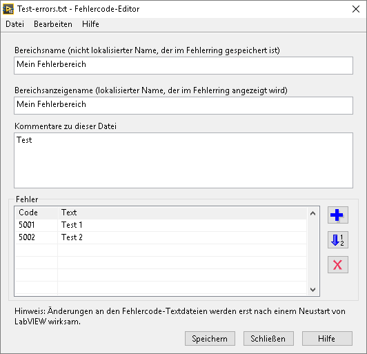 Ja, LabView wurde neu gestartet - ich konnte die Fehlercodes aber weiterhin nicht im "Fehlerring" unter "benutzerdefinierte Fehlercodes" sehen.