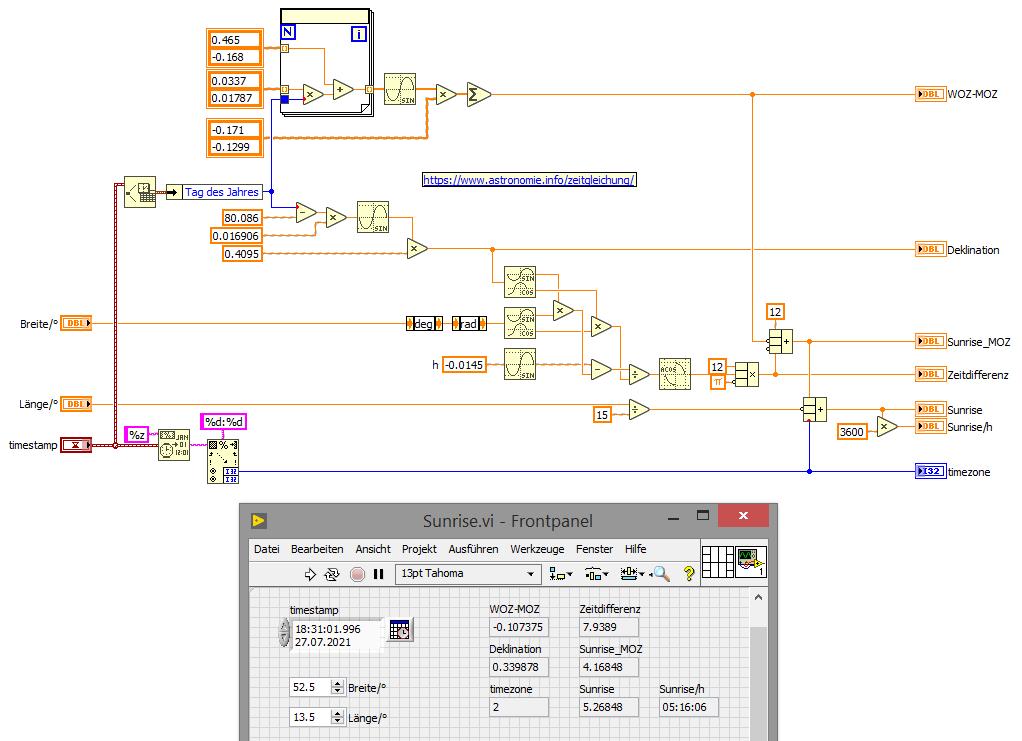 leider war meine Suche nicht erfolgreich, daher nun die Frage. Ich möchte die aktuellen (Ort und Tag) Sonnenaufgangs und untergangszeiten verwenden. Gibt es da vorgefertigte VIs oder über Internet abfragbare Tabellen? Ort könnte ich eingeben, Tag ist ja kein Problem. Nur die Berechnung....