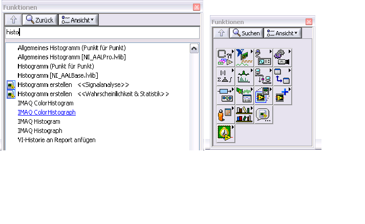 Das finden der "Bausteine", also Vis, ist mit der Suche-Funktion z.B. in der Palette des Blockdiagramms zu lösen..Tippen