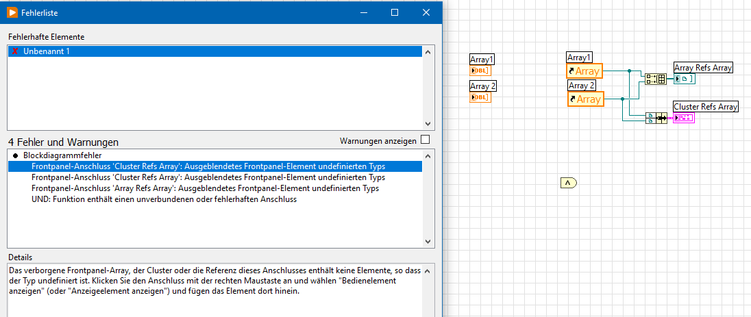 Jetzt hast du eine Referenz auf ein Array auf dem Frontpanel und dort passiert im Prinzip genau das gleiche. Du hast eine Referenz auf ein Array, aber was in dem Array drin ist (ein Double, ein Cluster, ein String oder sonst etwas) das ist nicht vorhanden. Und weil dort nichts drin ist, wird eine Fehlermeldung erzeugt.