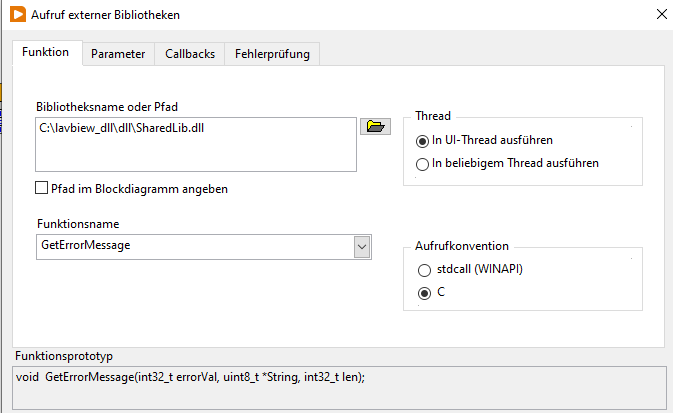 Ich habe mal versucht, den Code in LabVIEW nachzubauen, daraus eine dll zu erstellen und dann zu schauen, wie der Funktionsprototyp aussieht.