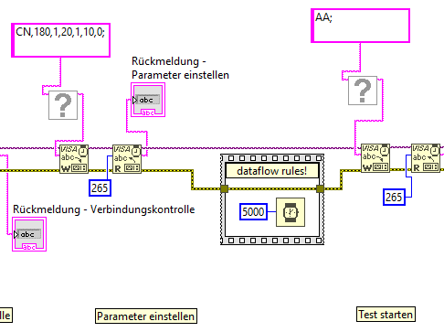 Und noch ein simpler Tipp: erstelle dir ein subVI namens "Wait with error IO" und packe das in deine user.lib. Das kannst du dann immer per Dataflow aufrufen, wenn du zwischen zwei Operationen gezielt warten willst. (Es gibt da garantiert was fertiges bei OpenG oder GPower.)