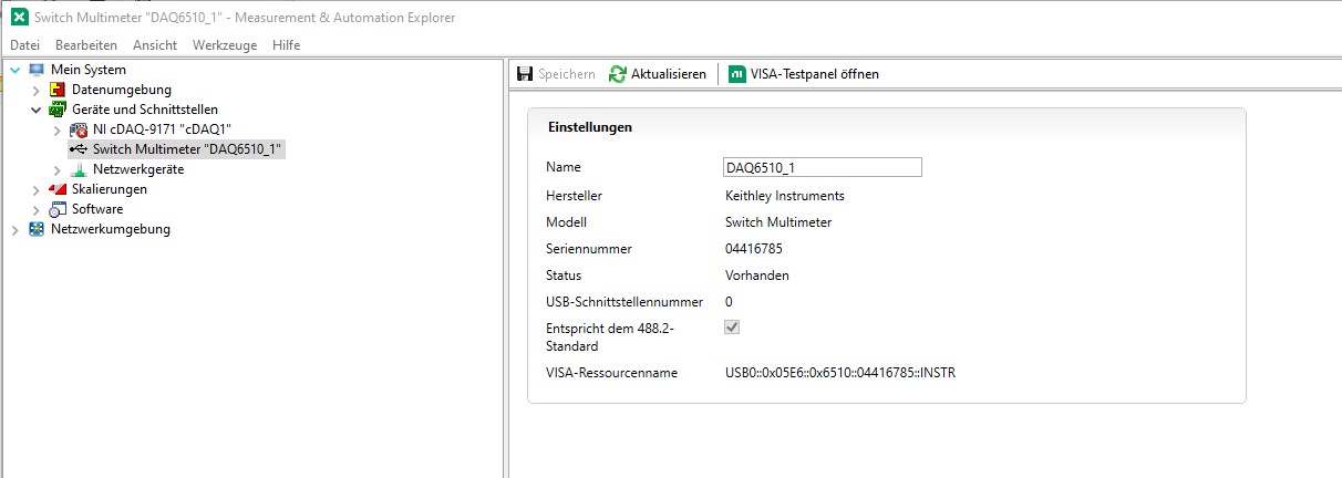 Du kannst in NI-MAX deinen DMMs einen Namen zuweisen und mit diesem dann das Gerät ansteuern. Ich habe das Gerät testweise DAQ6510_1 genannt und damit im VI den aktuellen Anzeigewert gelesen. Vielleicht hilft dieses VI.