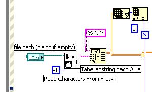 Also wenn Du in LabVIEW maximal faul sein und zum Einlesen die Funktion "aus Tabellenkalkulationsdatei lesen" verwenden willst. die Dir sofort 2D-Zahlen liefert, und wenn Du dort die Defaultwerte benutzen willst, dann sieht Dein String so aus: