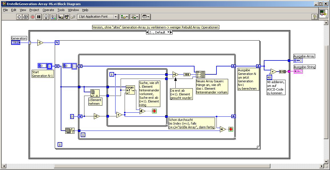 In den drei anderen Varianten werden immer 2 aufeinanderfolgende Elemente verglichen. Bei Elementwechsel wird entsprechend die nächste Generation weitergebaut. Variante 9 arbeitet hierbei mit Build-Array-Aufrufen, etwas unübersichtlicher, aber deutlich schneller, wird es dann in V10. Hier sind die Build-Array durch Replace-Array-Subset-Aufrufe ersetzt. V12 ist gegenüber V10 dahingehend speicheroptimiert, dass sowohl das Array der letzten Generation als auch das gerade zu bauende innerhalb desselben Arrays gespeichert werden. V10&V12 sind wie schon gesagt sehr schnell, allerdings bremst die Erzeugung eines Strings zusätzlich zum Array am Ende das Ganze doch sehr aus.