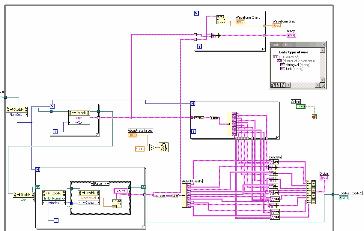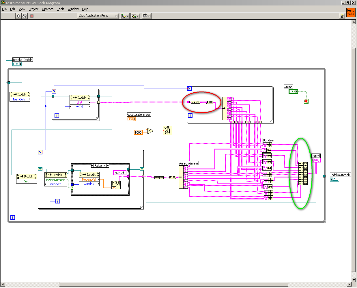 ' schrieb:Ich hab schon (viel) Ahnung, wie man mit Clustern und Arrays umgeht. Bloss wie Lucki und auch ich schon gesagt haben, woher diese üble ineinandergeschachtelte Struktur, die da in deinem SubVI "testo_measure1.vi" erzeugt wird?? Deshalb, meine Frage war hierzu eigentlich sehr spezifisch, ist dieses VI auch auf dem Mist von Testo gewachsen. Wenn nein, dann werden wir als erstes mal dort ansetzen. Nicht, weil es nicht anders auch geht, sondern damit es später einfacher geht!