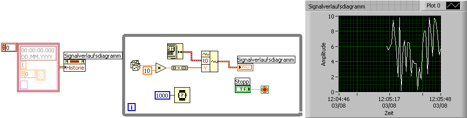 Frage: Da jeder Datenpunkt seinen eigenen Zeitstempel hat, müssen die Daten gar nicht zeitlich äquidistant sein (d.h. konstantes dt haben). Ich habe an den Timer in der Schleife statt konstant 1000 ms versuchsweise einen Zufallsgenerator angeschlossen, so daß die Wartezeit variiert (0..1000ms). Man sieht dann im Diagrammm, daß die Punkte zeitlich richtig eingetragen werden, d.h. ihr Abstand ist nicht konstant. Bisher dachte ich immer, daß solche Fälle nur mit einem XY-Graph zu lösen sind. Hast Du das schon gewußt? Ich bis jetzt nicht, und ich finde es erstaunlich, daß das so funktioniert.