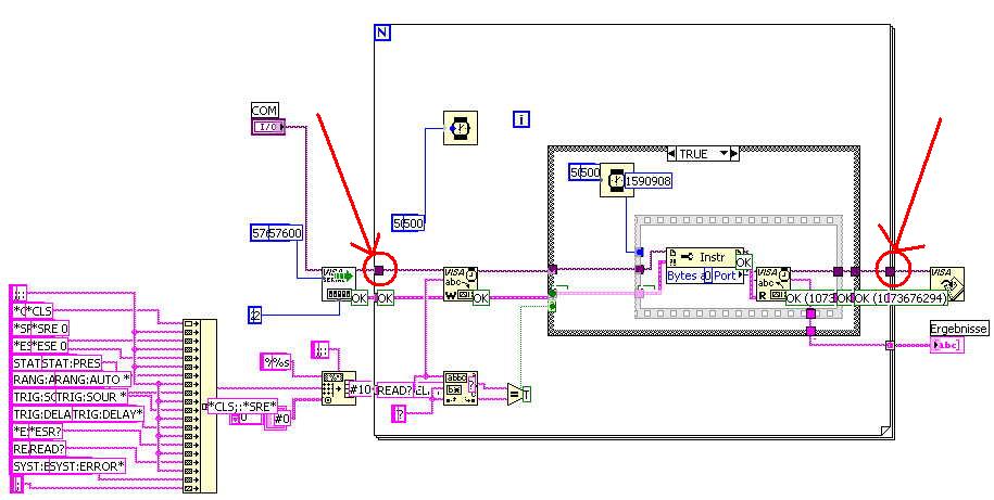Hmmm ... ich habs jetzt laufen lassen. Und mir im Highlightmodus angesehen. Läuft auch ganz gut, bis man zu den Befehlen mit den "?" kommt. Dann wartet das VI auf Daten vom Agilent und nach 10s kommt ein TimeOut. Das versteh ich nicht.
