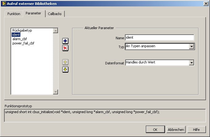 für buffer ist eben als Parametertyp Datenzeiger angegeben, das ist das dritte Feld von oben, wie du siehst ist es ausgegraut und gibt keine Möglichkeit einen Draht rannzuklemmen.