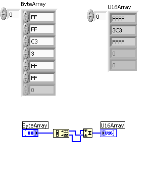 Ganz "einfacher" Fehler: Byte Order nicht beachtet, einfach nach der Array Dezimierung die Eingänge für die Verbindung der Zahlen auch richtig den high low Byte Eingängen zuordnen und es läuft wie gewünscht.