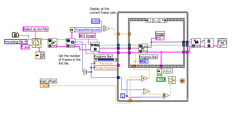 Habe im NI-Forum erfahren, dass es unter der Visio Hilfe ein Beispiel für "Play Avi" gibt. (NI Example Finder-> Vision-> Functions->read AVI Example.vi) Habe es ein wenig abgeändert, um einen Offset für die Start setzen zu können.