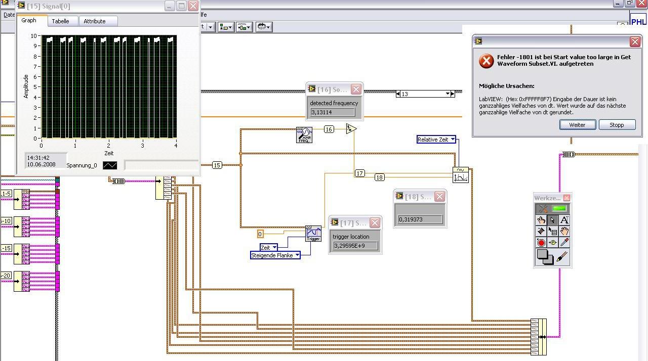 Ich habe, genau wie du gesagt hast, einen Fehlerbehadler angeschlossen und keine Fehlermeldung mehr erhalten. Allerdings hat die Fehlermeldung intern dazu geführt, dass die innere große Case Struktur im Programm Signalverlaufsabschnitt lesen nicht auf "False", sondern auf "True" steht. Konkret hat das Programm also die Fehlermeldung nicht mehr ausgespuckt, aber auch sonst nichts gemacht.