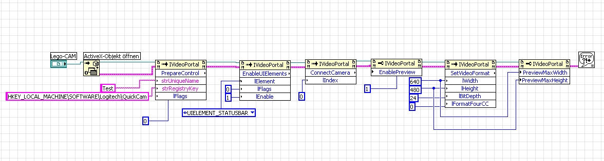 http://www.cs.unc.edu/~parente/LabVIEW/index.shtml unter User.lib installiert und wollte das Beispiel-Programm test.vi (unter Menüpunkt "Webcam DLL") ausführen, bekomme jedoch nur ein schwarzes Bild. Führe ich eines der 4 VIs unter Webcam/Examples aus, stürzt mir LabVIEW mit folgender Fehlermeldung komplett ab: