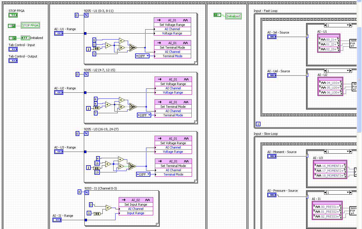 ' schrieb:Ich arbeite im FPGA mit Fixedpoint-Werten, die (wie mir gesagt wurde) bereits kalibriert sind (Calibrated Data im AI-Modul einstellen), allerdings ohne Linearisierung, aber damit kann ich leben. Diese wandle ich im FPGA direkt in I16-mV-Werten um und schicke sie dann zum RT. Dort skaliere ich sie dann entsprechend den Sensoren zu "physikalischen" Werten und verarbeite sie weiter. Ich hatte die Kalibrierung auch vorher im RT gemacht, war aber nicht so glücklich damit.