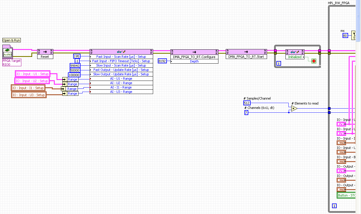 Wenn ich in der RT-Applikation das FPGA-VI starte, scheint sich das cRIO irgendwo vor oder in der "Wait for Initialize"-Loop aufzuhängen, d.h. schon vor der eigentlich Datenerfassung und DMA-Übertragung.
