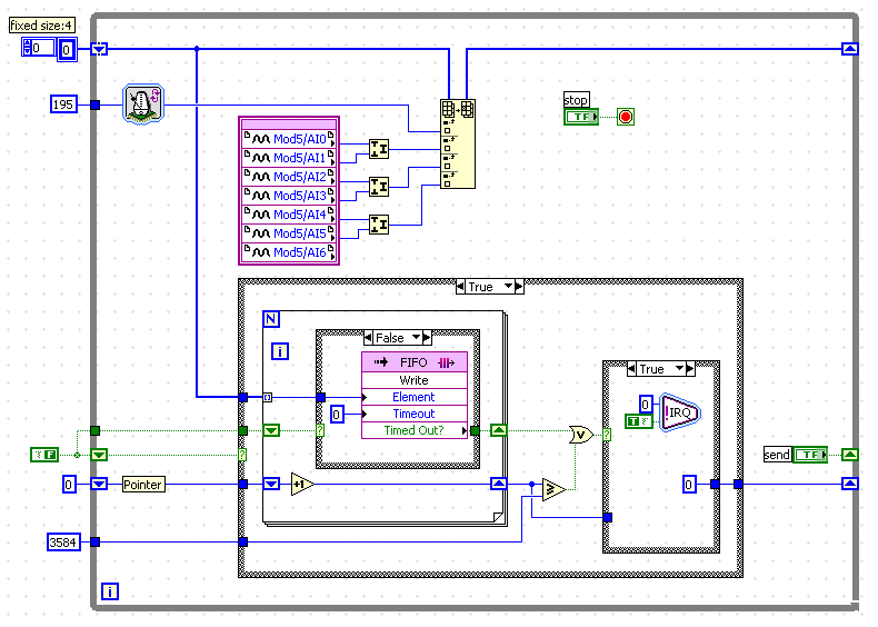 Ich hatte den IRQ im FPGA in der "schnellen" loop mit 195µs (5.13kHz) eingebaut. Ich habe einen DMA-FIFO-Kanal vom FPGA zum RT für 7 Analogwerte, die mit 5.13kHz gescannt werden. Nach 512 Schleifendurchläufen wird der IRQ gesetzt (=3584 Werte). Im RT lese ich dann diese 3584 Werte alle 80ms aus (etwas schneller als im FPGA, um Datenverluste zu vermeiden). Den DMA-Kanal habe ich sicherheitshalber größer gesetzt, auf 8192 Werte.