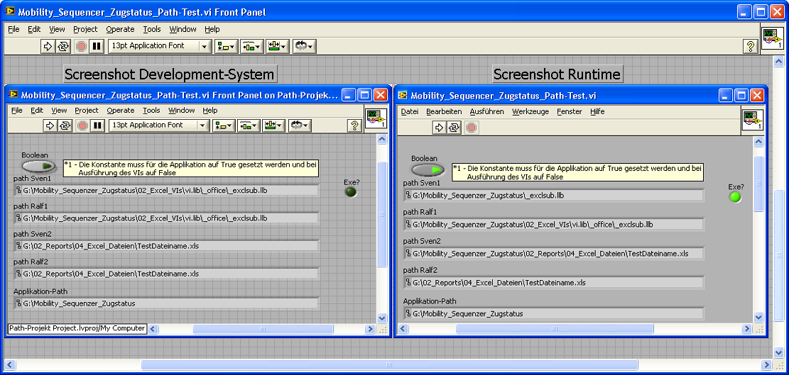 Zur strukturellen Aufbau der Speicherorte sei gesagt, dass sich bisher das VI Mobility_Sequencer_Zugstatus mit der excel.llb in einem Ordner befindet. Die SubVIs sind in einem Ordner zusammengefasst, der sich im Ordner vom Mobility_Sequencer_Zugstatus mit der excel.llb befindet. Der Speicherort für die Excel-Dateien liegt eine Ordnerstruktur höher als die des Mobility_Sequencer_Zugstatus VI. Dort muss der Ordner "02_Reports" angelegt werden, welcher den Ordner "04_Excel_Dateien" enthält. Die Struktur es etwas kompliziert. Ich hoffe es trotzdem verständlich beschrieben zu haben.