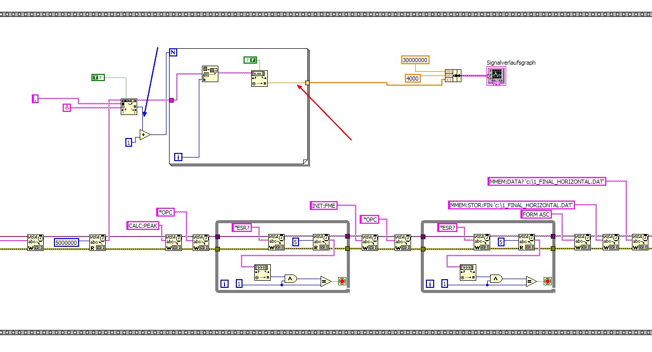 das mit dem array hab ich schon gemacht. also wenn ich von 30Mhz-230Mhz messe, dann hat der ja 200Mhz Messbereich. Dieser bereich ergeben 50000 Zeilen/Werte. Diese müssen einzeln in der Schleife abgearbeitet werden. dann werden diese in den array gepackt.